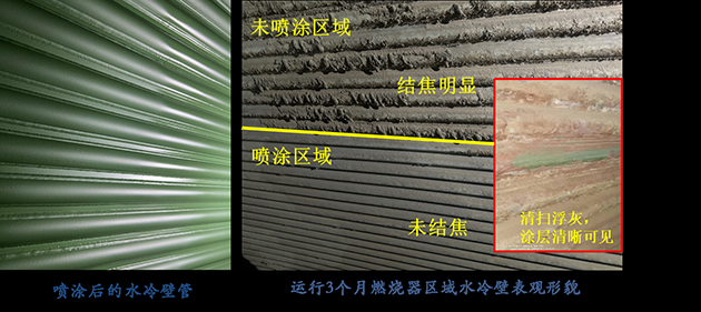 噴涂防護(hù)材料的受熱面就像穿了一件“鋼鐵鎧甲”,阻隔了外部腐蝕介質(zhì)的侵入,減少了鍋爐高溫?zé)煔庵腥廴谖飳鼙诘酿じ?,保護(hù)水冷管壁表面不受結(jié)焦、高溫腐蝕的影響;并且涂層與基材具有匹配的導(dǎo)熱率和熱膨脹系數(shù),不影響鍋爐的傳熱效率以及使用壽命。同時,防護(hù)材料還具有的紅外輻射功效,可強(qiáng)化爐膛內(nèi)輻射傳熱,降低爐膛出口煙溫;強(qiáng)化燃燒,提高煤粉的燃盡率,降低煤耗、提高煤種的適應(yīng)性。
