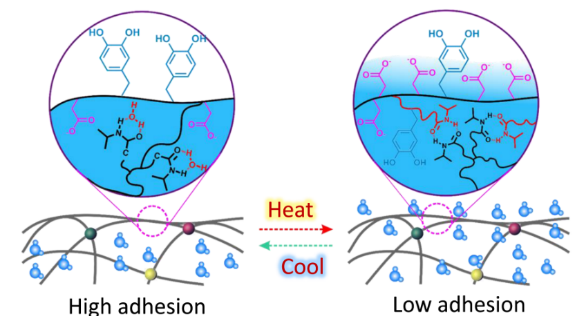 這項突破并非一蹴而就。周峰回憶,幾年前,團隊一直攻關(guān)高強韌黏附水凝膠材料,偶然發(fā)現(xiàn)一種材料在多次按壓后黏性驟降。“該現(xiàn)象引發(fā)了我們的極大興趣,經(jīng)過對材料的成分分析、機理驗證等,才知道原來在多次按壓以后,手部溫度傳遞到凝膠表面,致使凝膠發(fā)生相變,呈現(xiàn)低黏附態(tài)。”這讓團隊意識到,溫度可能是調(diào)控黏附性能的鑰匙。