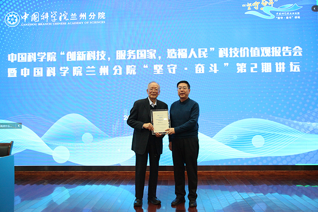 蘭州分院分黨組成員、紀(jì)檢組組長吳建剛為薛群基院士頒發(fā)宣講證書,號召分院系統(tǒng)科研人員和研究生向以薛群基院士等為代表的老一輩科學(xué)家們學(xué)習(xí),用實(shí)際行動(dòng)傳承踐行他們求真務(wù)實(shí)、報(bào)國為民、扎根西部、無私奉獻(xiàn)的精神,切實(shí)履行好國家戰(zhàn)略科技力量主力軍的職責(zé)使命,為早日實(shí)現(xiàn)高水平科技自立自強(qiáng)、建設(shè)科技強(qiáng)國作出更大貢獻(xiàn)。