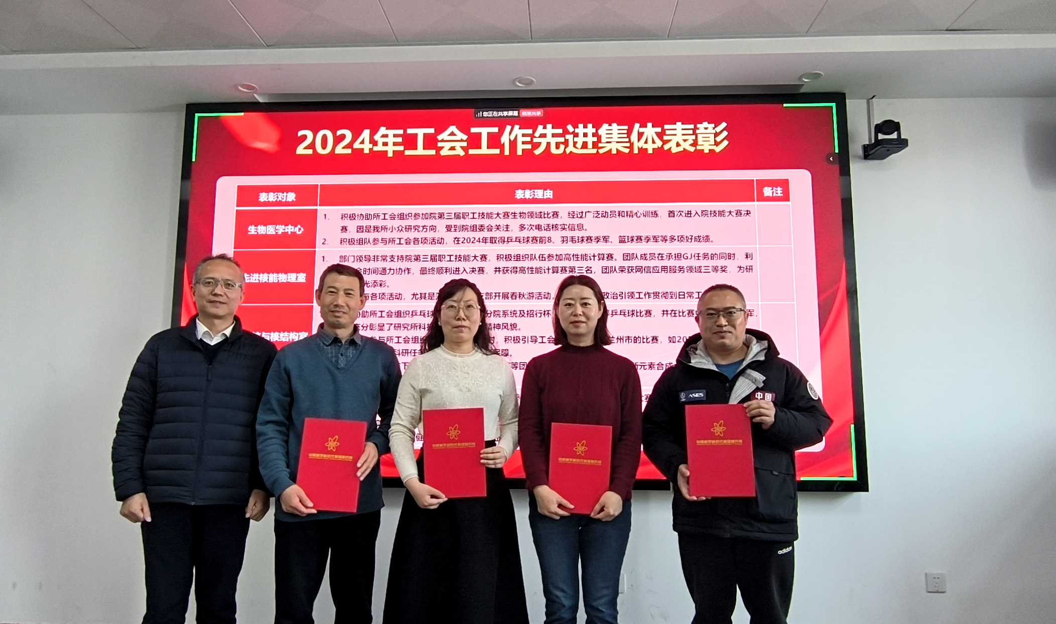 所黨委委員、工會(huì)副主席張雪熒為2024年工會(huì)工作先進(jìn)集體和先進(jìn)個(gè)人頒發(fā)證書,并對(duì)大家一年來(lái)的辛勤付出表示感謝和肯定。希望在新的一年凝聚共識(shí),齊心協(xié)力為研究所發(fā)展獻(xiàn)言建策,增強(qiáng)工會(huì)組織活力,以高質(zhì)量工會(huì)工作服務(wù)全所職工,服務(wù)搶占科技制高點(diǎn)中心任務(wù)。