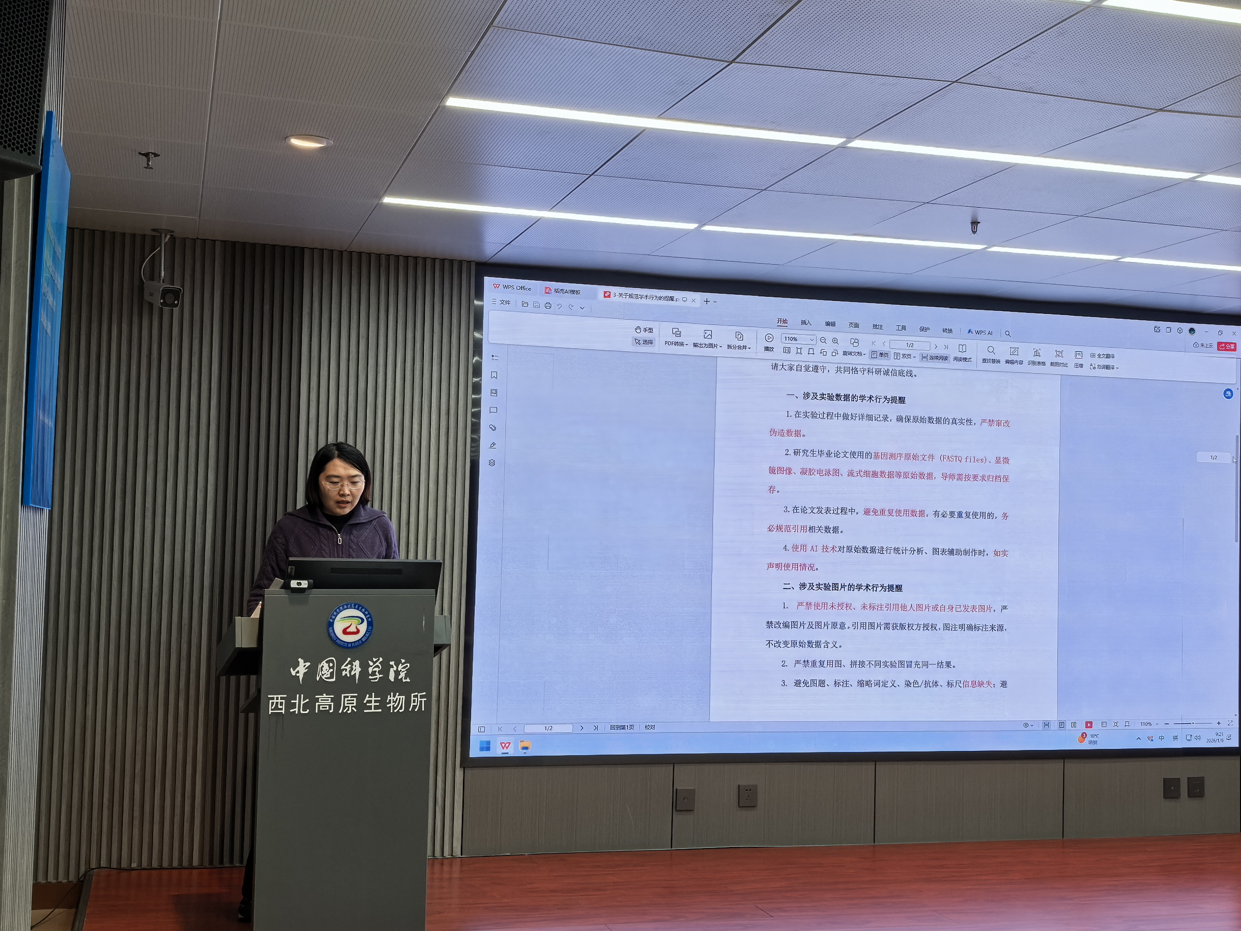 隨后,組織委員兼紀檢委員李彩霞傳達學(xué)習(xí)了中國科學(xué)院西北高原生物所學(xué)術(shù)委員會《關(guān)于規(guī)范學(xué)術(shù)行為的提醒》,與會人員集體觀看了科研誠信教育視頻《學(xué)術(shù)倫理:青年學(xué)者必須跨越的五條治學(xué)門檻》。