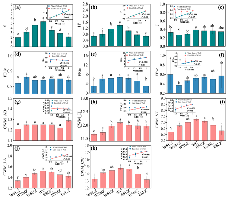 注:WSLZ、WSMZ、WSUZ、WC、ESUZ、ESMZ和ESLZ分別代表長城西側墻體1/4高、長城西側墻體1/2高、長城西側墻體3/4高、長城頂部、長城東側墻體3/4高、長城東側墻體1/2高、長城東側墻體1/4高;插入的子圖為維管束植物各指標與長城相對高度的線性回歸分析.