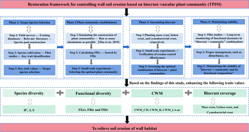 研究發(fā)現(xiàn),維管束植物物種豐富度、物種多樣性、功能豐富度、群落加權平均和苔蘚結皮蓋度由土長城遺址頂部向下部顯著降低,且與土長城兩側土體侵蝕程度呈負相關(圖1),表明土長城本體較高的區(qū)域有利于維管束植物和生物結皮的定殖和生長。同時,維管束植物和生物結皮的協(xié)同作用能有效緩解遺址本體遭受風雨侵蝕(圖2)。基于此,研究人員提出了基于生物結皮和維管束植物群落構建目標物種選擇、植物群落構建、生物結皮接種和維持群落穩(wěn)定等增強土長城抗侵蝕的“修復框架”(圖3),為土長城遺址本體侵蝕防治提供了新思路。