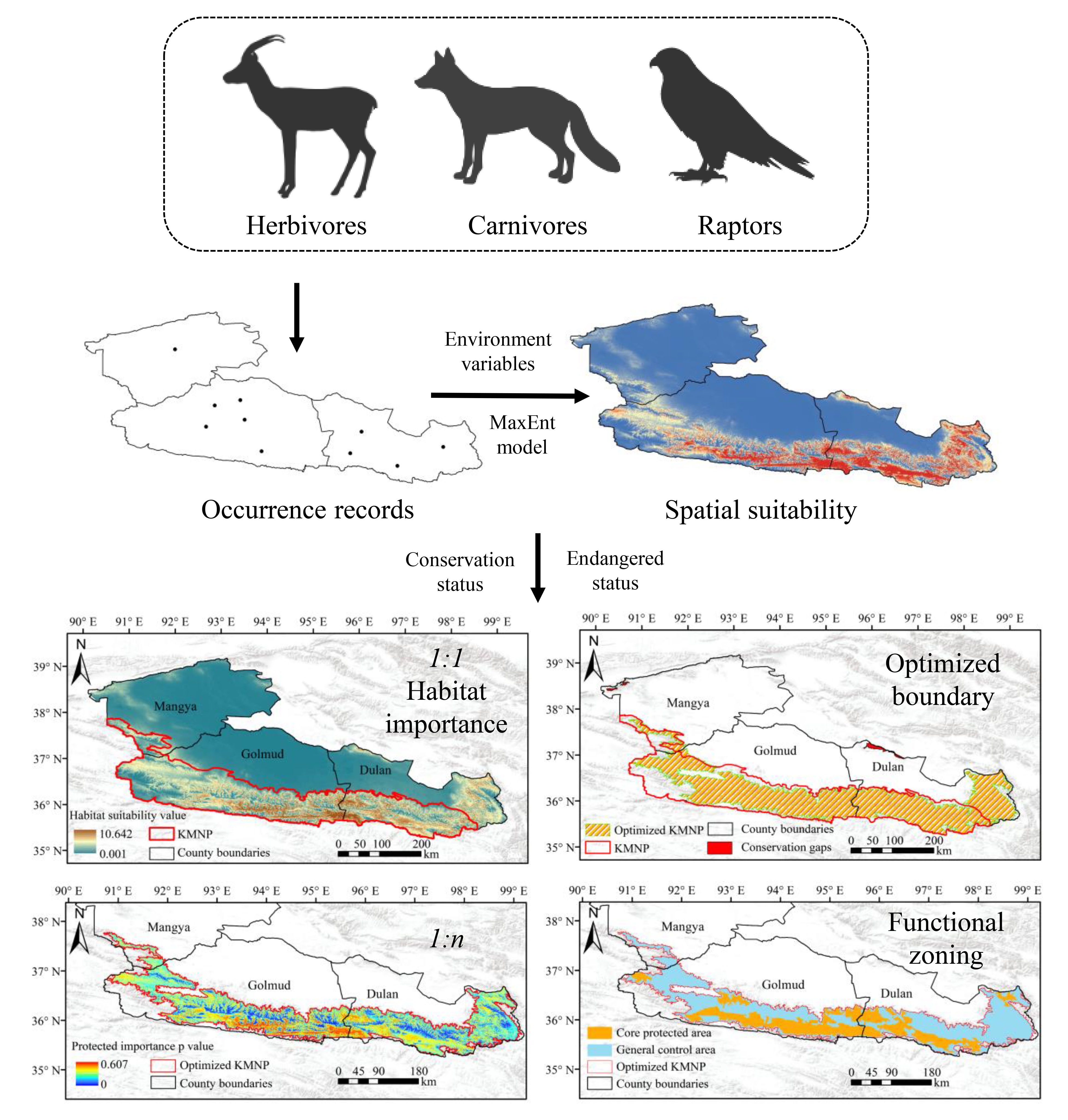 在全球生物多樣性不斷下降的背景下,我國國家公園的建設成為保護生物多樣性的重要舉措之一,為保護珍稀瀕危物種、維持生態(tài)平衡和促進可持續(xù)發(fā)展發(fā)揮著關鍵作用。然而,國家公園的邊界范圍劃分及其功能分區(qū)是否合理對維護其生態(tài)系統(tǒng)的完整性和物種的多樣性十分關鍵,不僅應基于自然生態(tài)系統(tǒng)的界限,并確保保護區(qū)域內(nèi)的生態(tài)系統(tǒng)完整性和生態(tài)過程的連續(xù)性,還需要充分考慮到區(qū)域內(nèi)的生物多樣性,重點考慮瀕危物種和關鍵棲息地的保護,有助于保持生態(tài)系統(tǒng)的穩(wěn)定性和生態(tài)過程的連續(xù)性。昆侖山區(qū)是亞洲水塔青藏高原的核心組成部分,也是我國乃至亞洲的生態(tài)安全屏障和重要水源涵養(yǎng)地,2021年,國家公園管理局將昆侖山納入國家公園規(guī)劃候選區(qū)并有序推進國家公園建設,其邊界范圍及功能區(qū)劃還未完全確立。