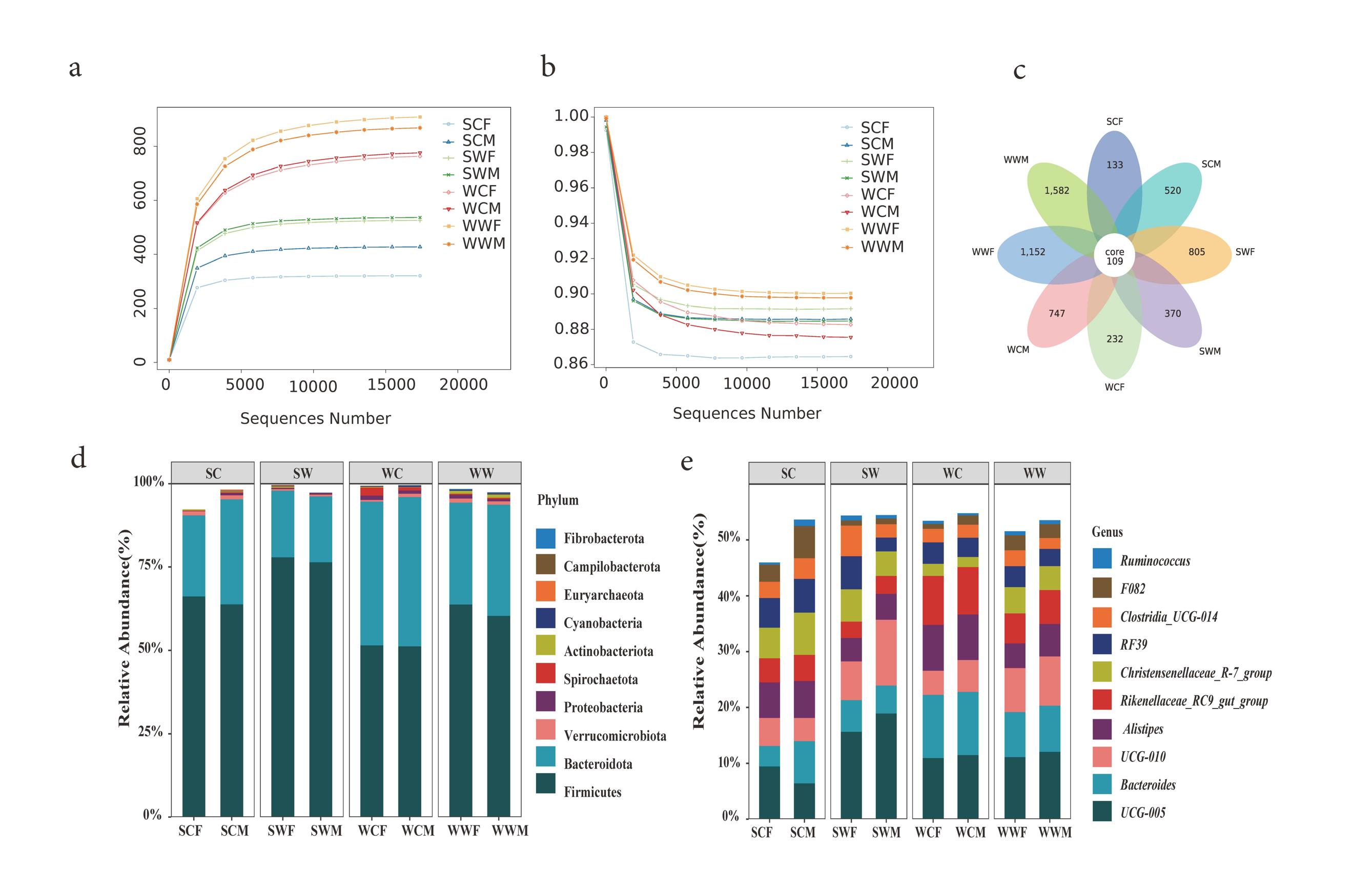 巖羊腸道菌群群落豐富度(a)和均勻度(b)稀釋曲線;不同組間ASV數(shù)量花瓣圖(c);門水平(d)和屬水平(e)巖羊腸道菌群相對豐度堆積直方圖