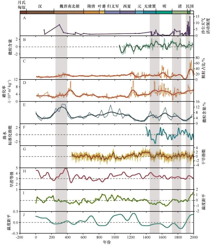 圖2? 敦煌歷史時(shí)期沙塵天氣活動(dòng)強(qiáng)度序列(A),敦德冰芯微粒含量(B),蘇干湖沉積物粗粒含量(C),蘇干湖沉積物磁化率(D),巴里坤湖沉積物組分含量(E),河西走廊近600年降水序列(F),河西走廊帕爾默干旱度指數(shù)(scPDSI)序列(G),黑河流域近2 000年旱澇序列(H),Yang等重建的中國2 000年溫度序列(I),Ge等重建的中國2 000年溫度序列(J)