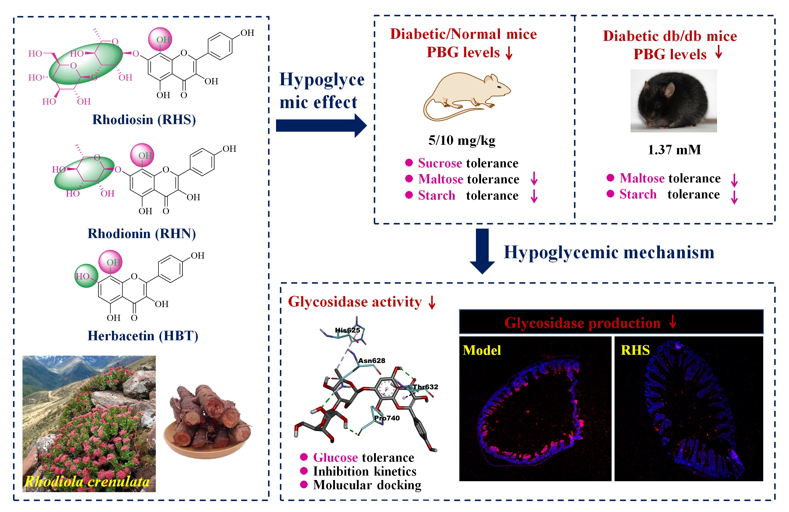 中國科學(xué)院西北高原生物研究所藏藥研究重點實驗室研究發(fā)現(xiàn)8-羥基黃酮類化合物RHS(5 mg/kg和10 mg/kg)能有效降低正常和糖尿病小鼠PBG水平。同時發(fā)現(xiàn),RHS、RHN和HBT在轉(zhuǎn)基因糖尿病小鼠中均具有顯著的PBG降低作用,其作用與阿卡波糖相當或強于阿卡波糖。值得注意的是,研究首次發(fā)現(xiàn)RHS不僅能夠抑制糖苷酶的活性,而且能夠顯著抑制該酶在小腸的表達,從而高效的降低PBG。而糖苷酶合成或者表達的抑制可能作為降糖藥物或者糖脂代謝調(diào)節(jié)藥物研發(fā)的新靶點。