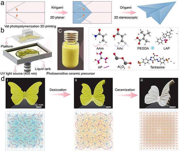 該團隊受折紙/剪紙藝術(shù)啟發(fā),以水性無機粘結(jié)劑磷酸二氫鋁(AP)溶膠為水凝膠單體分散介質(zhì),將水凝膠單體和納米陶瓷粉體混合來制備光敏性水凝膠陶瓷漿料;利用光固化3D打印獲得具有優(yōu)異的延展性、形狀適應性、抗疲勞性且可二次變形的水凝膠柔性骨架;依次經(jīng)過脫水干燥、低溫脫脂和高溫燒結(jié)等步驟,實現(xiàn)了具有超低收縮、高陶瓷產(chǎn)率和形狀保真度的懸空大跨度陶瓷結(jié)構(gòu)(圖1)。設計的柔性水凝膠基陶瓷前驅(qū)體能夠?qū)崿F(xiàn)從平面形狀到3D立體結(jié)構(gòu)的轉(zhuǎn)變,突破了傳統(tǒng)硬質(zhì)/脆性陶瓷前驅(qū)體來制造復雜陶瓷結(jié)構(gòu)的局限。