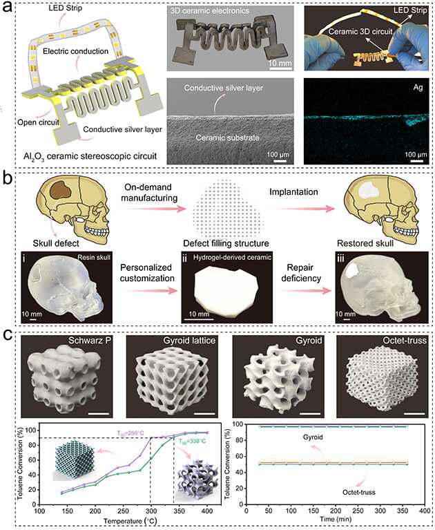 基于此方法,研究人員還可制造無支撐且大跨度的陶瓷三維電路,且這種陶瓷三維電路能很好地點亮LED燈帶。此外,利用水凝膠柔性骨架的可變形性,可按需或個性化制造具有顱骨缺損形狀的陶瓷結(jié)構(gòu)來實現(xiàn)骨缺陷部位修復。制造的陶瓷結(jié)構(gòu)還可結(jié)合表面改性策略創(chuàng)造性設計制備高性能的復雜結(jié)構(gòu)催化陶瓷器件,具有優(yōu)良的催化活性和穩(wěn)定性。研究人員還進一步拓展了這種方法在三維電路、生物醫(yī)用及功能催化領(lǐng)域的潛在應用(圖3)。