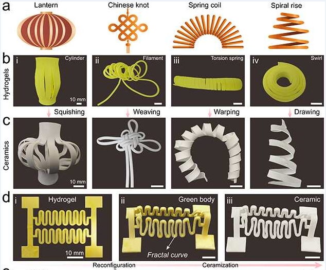 近日,中國科學院蘭州化學物理研究所潤滑材料重點實驗室3D打印摩擦器件組在采用3D打印柔性水凝膠前驅(qū)體制備復雜結(jié)構(gòu)陶瓷方面取得重要進展。該團隊發(fā)展了利用3D 打印水凝膠柔性骨架輔助高幾何復雜性、高打印精度和形狀保真度陶瓷成形的新方案,解決了傳統(tǒng)陶瓷制造中因脆性和剛性導致的形狀復雜性和尺寸收縮問題,展示了在立體電路、生物醫(yī)學和功能催化等領(lǐng)域廣泛的應用前景。