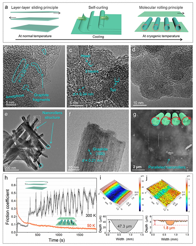 相關(guān)研究成果以“Acquisition of molecular rolling lubrication by self-curling of graphite nanosheet at cryogenic temperature” 為題發(fā)表在Nature Communications(2024, 5, 5747; https://doi.org/10.1038/s41467-024-49994-4)上。蘭州化物所博士后李畔畔和項(xiàng)目副研究員何文豪為論文共同第一作者,吉利研究員、魯志斌研究員、李紅軒研究員和陳建敏研究員為共同通訊作者。