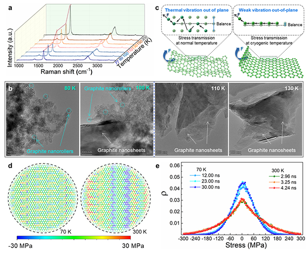 結(jié)合實(shí)驗(yàn)和理論模擬系統(tǒng),研究團(tuán)隊(duì)研究了石墨納米片邊緣自卷翹形變的影響因素、結(jié)構(gòu)演變和形成機(jī)理。結(jié)果表明,超低溫環(huán)境下,非平衡溫度場(chǎng)導(dǎo)致了原子的不均勻收縮,石墨片上下表面產(chǎn)生了方向相反的應(yīng)力,驅(qū)動(dòng)了石墨片邊緣的自卷翹;同時(shí)發(fā)現(xiàn)熱振動(dòng)對(duì)原子間應(yīng)力傳遞的耗散作用,當(dāng)溫度低于100K時(shí),原子熱振動(dòng)顯著減弱,原子間應(yīng)力傳遞耗散被抑制,促進(jìn)了石墨納米片自卷翹形變的發(fā)生。該研究將為認(rèn)識(shí)微觀粒子受力傳遞規(guī)律和納米形變機(jī)理提供新的理解,同時(shí)發(fā)現(xiàn)了一種利用溫度操控自卷曲納米形變行為的新方法,在潤滑、傳感等眾多領(lǐng)域具有廣泛應(yīng)用價(jià)值。