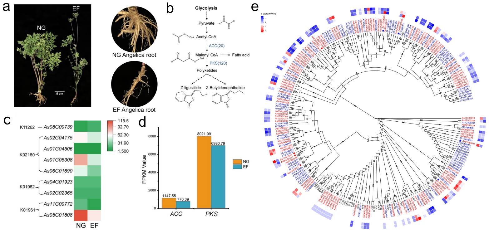 圖 苯酞類物質(zhì)的合成與調(diào)控 a.正常生長(zhǎng)當(dāng)歸(NG)和早花當(dāng)歸(EF) b.丙二酰輔酶A的合成代謝途徑 c.正常當(dāng)歸和早花當(dāng)歸根中ACC基因的表達(dá)量熱圖 d. 正常當(dāng)歸和早花當(dāng)歸根中ACC基因和PKS基因的表達(dá)量值(FPKM)e.當(dāng)歸中PKS基因的進(jìn)化樹,及其在正常當(dāng)歸和早花當(dāng)歸中根的表達(dá)量熱圖。
