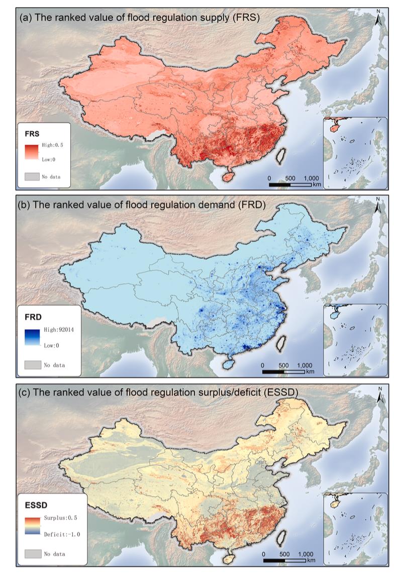 FRESF工具箱2號(hào)模塊的示例輸出,空間明確地繪制了我國(guó)2020年洪水調(diào)蓄生態(tài)系統(tǒng)服務(wù)的供給 (a)、需求?。╞) 和赤字 (c)