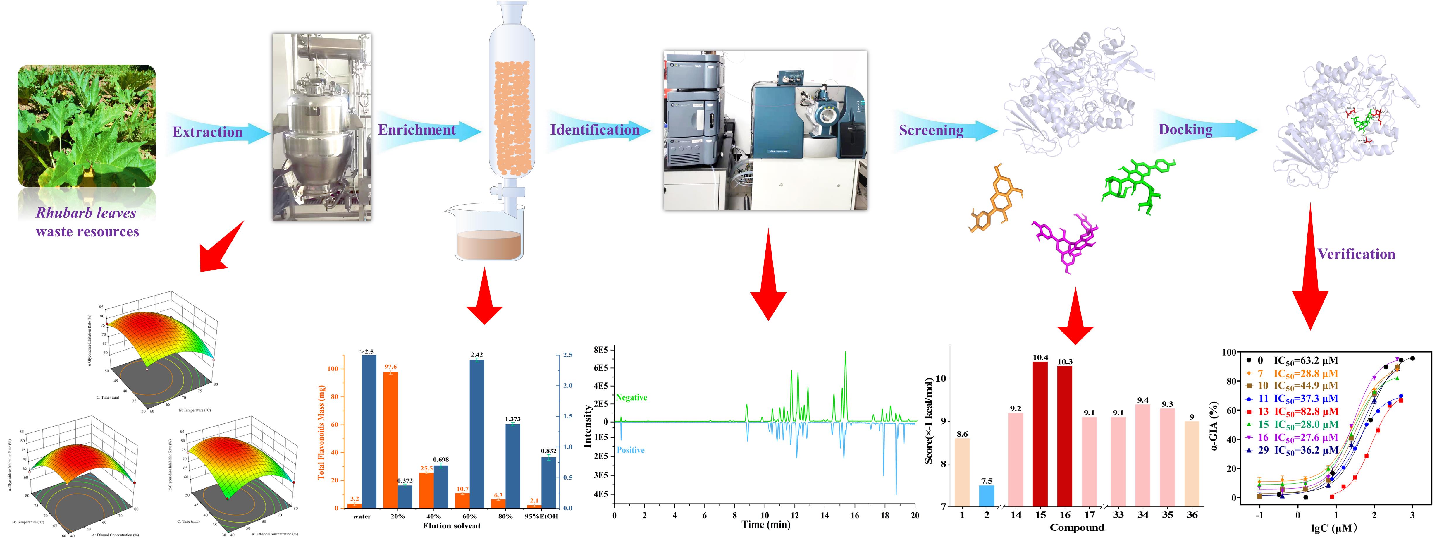 中國科學(xué)院西北高原生物研究所高原藏藥資源質(zhì)控與藥理毒理評(píng)價(jià)研究團(tuán)隊(duì)以α-葡萄糖苷酶抑制活性作為關(guān)鍵評(píng)價(jià)指標(biāo),建立了基于大孔吸附樹脂富集、UPLC-QTOF-MS/MS分析表征、分子對(duì)接、體外驗(yàn)證的唐古特大黃葉中α-葡萄糖苷酶抑制劑的系統(tǒng)篩選策略,篩選得到myricitrin、rumarin等6個(gè)α-葡萄糖苷酶抑制劑。基于穩(wěn)態(tài)、同步、三維熒光光譜和遠(yuǎn)紫外圓二色譜等多光譜技術(shù)的對(duì)接機(jī)制研究表明,6個(gè)抑制劑均能與α-葡萄糖苷酶發(fā)生結(jié)合并改變靶蛋白的酪氨酸和色氨酸殘基微環(huán)境,通過降低靶蛋白α-螺旋或β-轉(zhuǎn)角等二級(jí)結(jié)構(gòu)的含量從而導(dǎo)致蛋白酶失活,該研究為唐古特大黃廢棄資源的利用提供了新的見解。