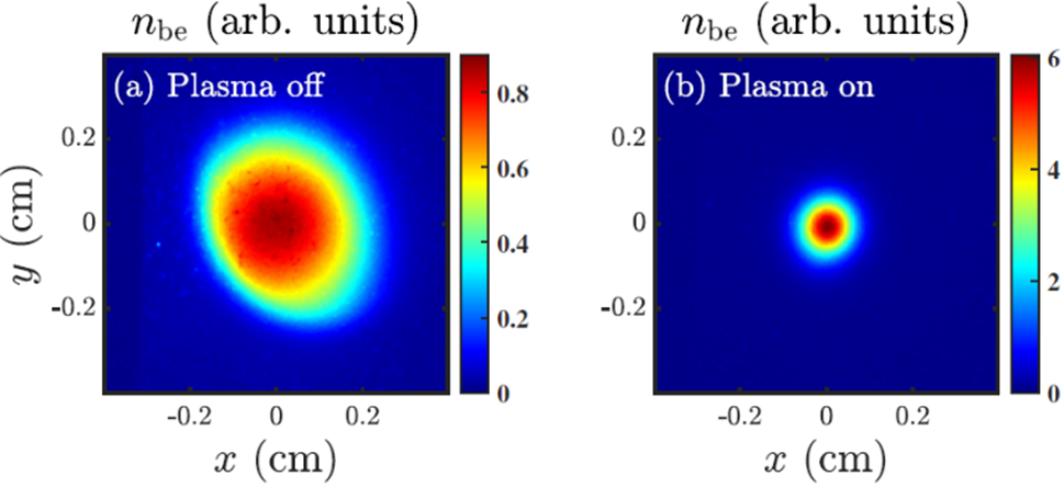 實驗中,基于高能電子成像實驗平臺,科研人員利用熱陰極微波電子槍產(chǎn)生的電子束及高壓直流放電等離子體靶,成功觀察到電子束在有源等離子體透鏡中的聚焦現(xiàn)象,同時對其聚焦原理深入分析。實驗結(jié)果表明(圖1):當(dāng)?shù)入x子體靶不放電時,YAG屏上的束斑為1.25 mm,而該靶調(diào)節(jié)至合適的放電電壓和氣壓后,束斑減小至0.48mm,聚焦效果顯著!
