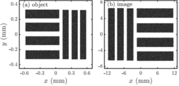 鑒于有源等離子體透鏡具有緊湊、聚焦梯度大、對稱聚焦、色差小的優(yōu)勢,科研人員將該透鏡成功應(yīng)用到高能電子成像中。從高能電子束在透鏡中的傳輸矩陣出發(fā),科研人員設(shè)計了一個總長為44.87cm、放大倍數(shù)為20的高能電子成像系統(tǒng),其點對點成像模擬結(jié)果如圖2所示。模擬結(jié)果表明:該系統(tǒng)的成像分辨率可以達(dá)到亞微米量級,相較于基于電磁四極鐵的全長為5m(放大倍數(shù)為10)的成像系統(tǒng)十分緊湊。