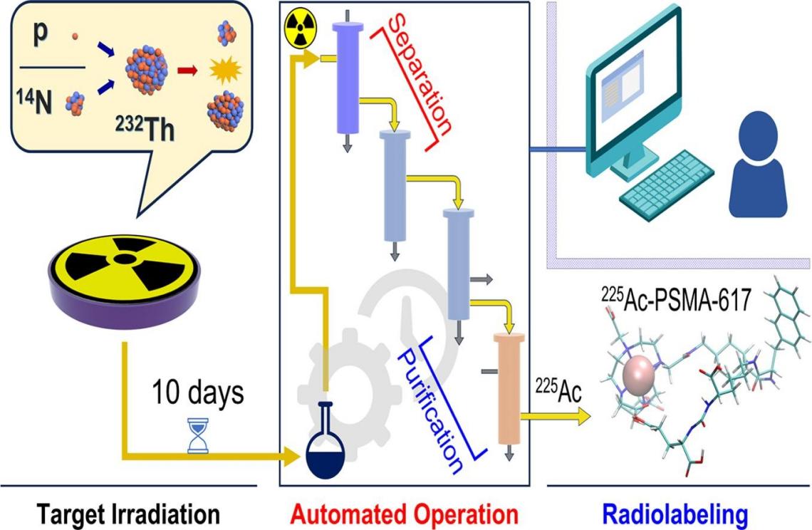 鐳-223(半衰期為11.4天)和錒-225(半衰期為10天)作為兩種極具潛力的阿爾法發(fā)射同位素,由于其獨(dú)特的物理化學(xué)性質(zhì),在小體積腫瘤和多位點(diǎn)轉(zhuǎn)移性癌癥的治療中展現(xiàn)出廣泛的應(yīng)用前景。然而,傳統(tǒng)的鐳-223和錒-225生產(chǎn)方法復(fù)雜且效率不高,難以滿足日益增長的需求,迫切需要開發(fā)出一種高效且自動化的制備系統(tǒng)。