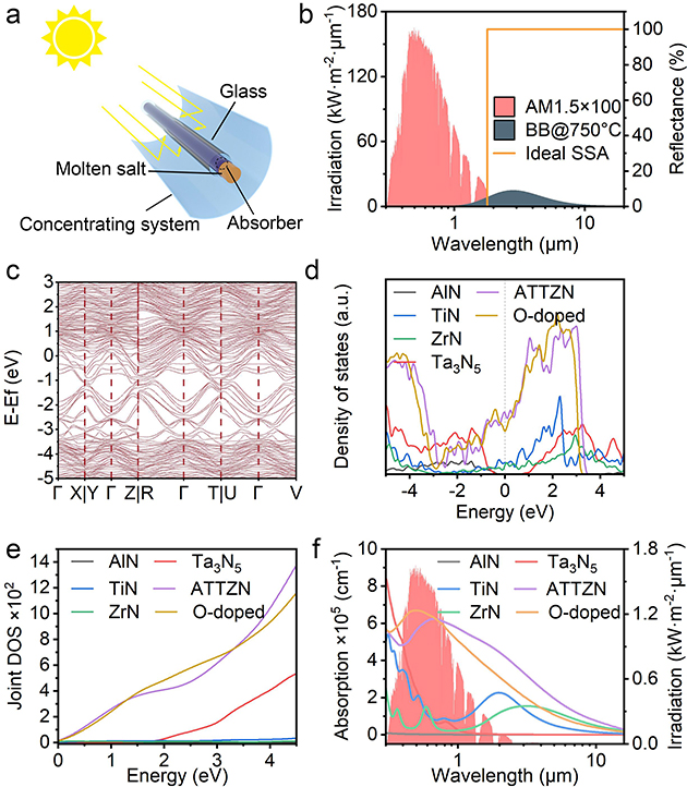 基于高熵氮化物光吸收材料的前期研究,為滿足聚光太陽能系統(tǒng)高溫(750°C)工況下的應(yīng)用需求,研究人員精心選擇了構(gòu)成元素,并系統(tǒng)性地研究了高熵設(shè)計(jì)對材料電子結(jié)構(gòu)的影響(圖1)。研究結(jié)果顯示,高熵氮化物的復(fù)雜能帶結(jié)構(gòu)顯著提高了費(fèi)米能級(jí)附近的態(tài)密度。同時(shí),平坦的能帶結(jié)構(gòu)拓寬了材料的太陽能吸收范圍,并增強(qiáng)了帶間躍遷效應(yīng),提升了材料的太陽能吸收性能。