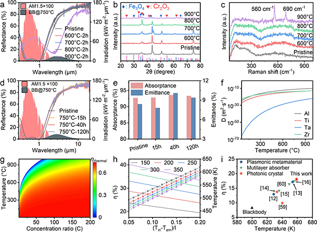 該團(tuán)隊(duì)通過反應(yīng)磁控濺射法制備出由高熵氮化物吸收層和氮化硅減反射層組成的雙層光譜選擇性吸收涂層。在太陽光譜波段(0.3-2.5 μm)表現(xiàn)出92.7%的吸收率,紅外波段的熱發(fā)射率僅為8.4%。在1 kW·m-2模擬太陽光輻照條件下,涂層表面溫度在10分鐘內(nèi)可達(dá)到83.3°C;在戶外應(yīng)用中,其平衡溫度與非選擇性涂層的差異高達(dá)~21°C,展現(xiàn)出優(yōu)異的光熱轉(zhuǎn)換效率和光譜選擇性。此外,得益于高熵效應(yīng)和緩慢擴(kuò)散效應(yīng)帶來的結(jié)構(gòu)穩(wěn)定性,該涂層在750°C退火后仍保持了出色的光學(xué)性能(圖2)。該涂層憑借其出色的光熱轉(zhuǎn)換能力、優(yōu)異的熱穩(wěn)定性和簡單易于規(guī)?;a(chǎn)的雙層結(jié)構(gòu),在提升槽式聚光發(fā)電系統(tǒng)效率方面具有重要意義,并為能源新質(zhì)生產(chǎn)力發(fā)展提供了技術(shù)支撐。相關(guān)研究成果發(fā)表在Advanced Functional Materials (2024,2411316)上。趙鵬博士為論文的第一作者,高祥虎研究員和何成玉博士后為共同通訊作者。