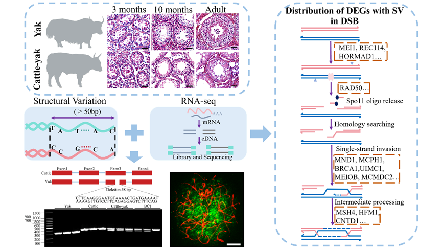 中國(guó)科學(xué)院西北高原生物研究所動(dòng)物生態(tài)與資源保護(hù)研究團(tuán)隊(duì)通過(guò)整合牦牛和普通牛基因組SV位點(diǎn)信息和轉(zhuǎn)錄組數(shù)據(jù),對(duì)牦牛、犏牛和回交一代(BC1)睪丸組織在幾個(gè)關(guān)鍵發(fā)育階段的組織學(xué)特征、轉(zhuǎn)錄組圖譜以及SV在差異表達(dá)基因(DEGs)中的分布進(jìn)行了表征。結(jié)果發(fā)現(xiàn),在犏牛睪丸組織中,與精原細(xì)胞命運(yùn)決定、減數(shù)分裂重組和DSB修復(fù)等過(guò)程相關(guān)的基因表達(dá)下調(diào),且在每個(gè)發(fā)育階段犏牛中均有一定比例的DEGs含有SV。比如,3月齡犏牛27.78%的DEGs(50/180)中分布有180個(gè)SV,其中大部分SV(147/180)位于內(nèi)含子區(qū);10月齡犏牛27.73%的DEGs(1750/6310)中分布有8741個(gè)SV,其中大部分SV位于內(nèi)含子區(qū)(7640/8741),少量的SV位于外顯子區(qū)(50/8741)和UTR區(qū)(18/8741)等,這些SV可能會(huì)影響基因的表達(dá)。對(duì)其中的候選基因ESCO2和BRDT進(jìn)行了表達(dá)驗(yàn)證,發(fā)現(xiàn)ESCO2在牦牛和犏牛精母細(xì)胞細(xì)線期表達(dá),BRDT在牦牛精母細(xì)胞偶線期和粗線期表達(dá),但在犏牛中只在偶線期表達(dá)。相較于牦牛,犏牛中ESCO2和BRDT的表達(dá)均下調(diào)。此外,還發(fā)現(xiàn)差異表達(dá)的X連鎖基因在10月齡(123/252)和成年(206/274)的犏牛中多數(shù)表達(dá)上調(diào),這可能與減數(shù)分裂性染色體失活(MSCI)異常有關(guān),凸顯了 X 染色體在雜交不育中的作用。然而,相較于犏牛無(wú)法產(chǎn)生精子,BC1曲細(xì)精管中出現(xiàn)了少量的圓形精子,并且與精子形成相關(guān)的基因(TSSK6, TSKS, TBC1D21, TPPP2, SPPL2C等)表達(dá)上調(diào),但仍低于牦牛正常精子發(fā)生水平,表明精子發(fā)生缺陷和基因表達(dá)異常在BC1中得到了部分恢復(fù)。本研究獲得了牦牛和犏牛在關(guān)鍵發(fā)育階段的DEGs 和SV位點(diǎn)信息,為了解SV在犏牛雄性不育以及物種雜交不育中的潛在功能提供了啟示。