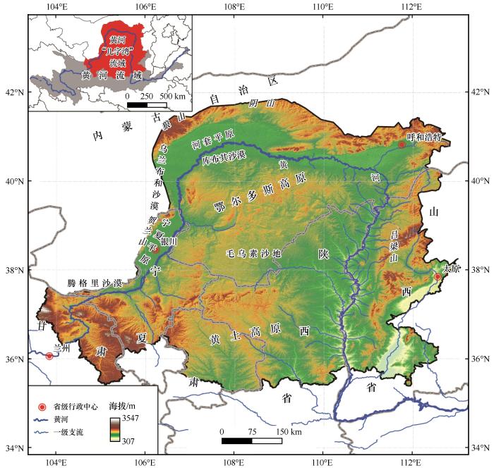 黃河“幾字彎”是荒漠化綜合防治和“三北”工程建設(shè)三大標(biāo)志性戰(zhàn)役的發(fā)起地之一,也是黃河流域生態(tài)保護(hù)和高質(zhì)量發(fā)展的重點區(qū)域。黃河“幾字彎”因黃河繞行此區(qū)域的形狀似彎曲環(huán)抱的“幾”字而得名,泛指黃河流經(jīng)的甘肅、寧夏、內(nèi)蒙古、陜西、山西五省份的行政都市圈(圖1)。