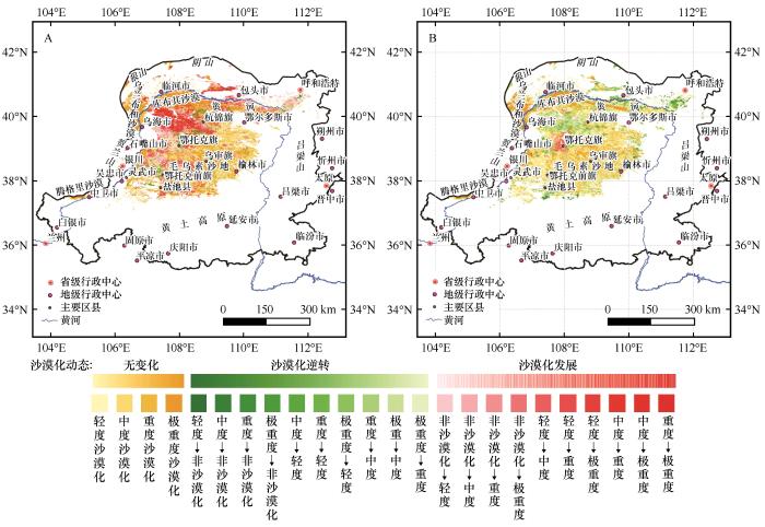 圖2?1975—2000年(A)和2000—2020年(B)黃河“幾字彎”沙漠化程度時空變化