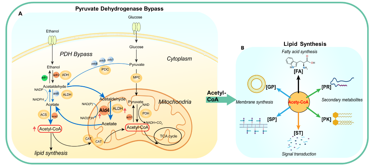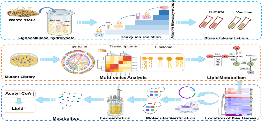 基于此現(xiàn)狀,科研人員利用蘭州重離子加速器(HIRFL)對目標突變體實施多輪輻射,結(jié)合ALE技術(shù)提高了酵母的抗逆性和耐受性,因此獲得了適應性更強的底盤細胞。再通過多組學聯(lián)合分析方法識別出與其發(fā)酵性能相關(guān)的重要基因,利用基因編輯技術(shù)對代謝通路進行精準優(yōu)化,著重優(yōu)化了核心代謝中間產(chǎn)物的代謝通量,使乙酰輔酶A水平較之前提高了17.10%,從而顯著提高了酵母在合成脂類和其他高附加值化合物方面的產(chǎn)量。