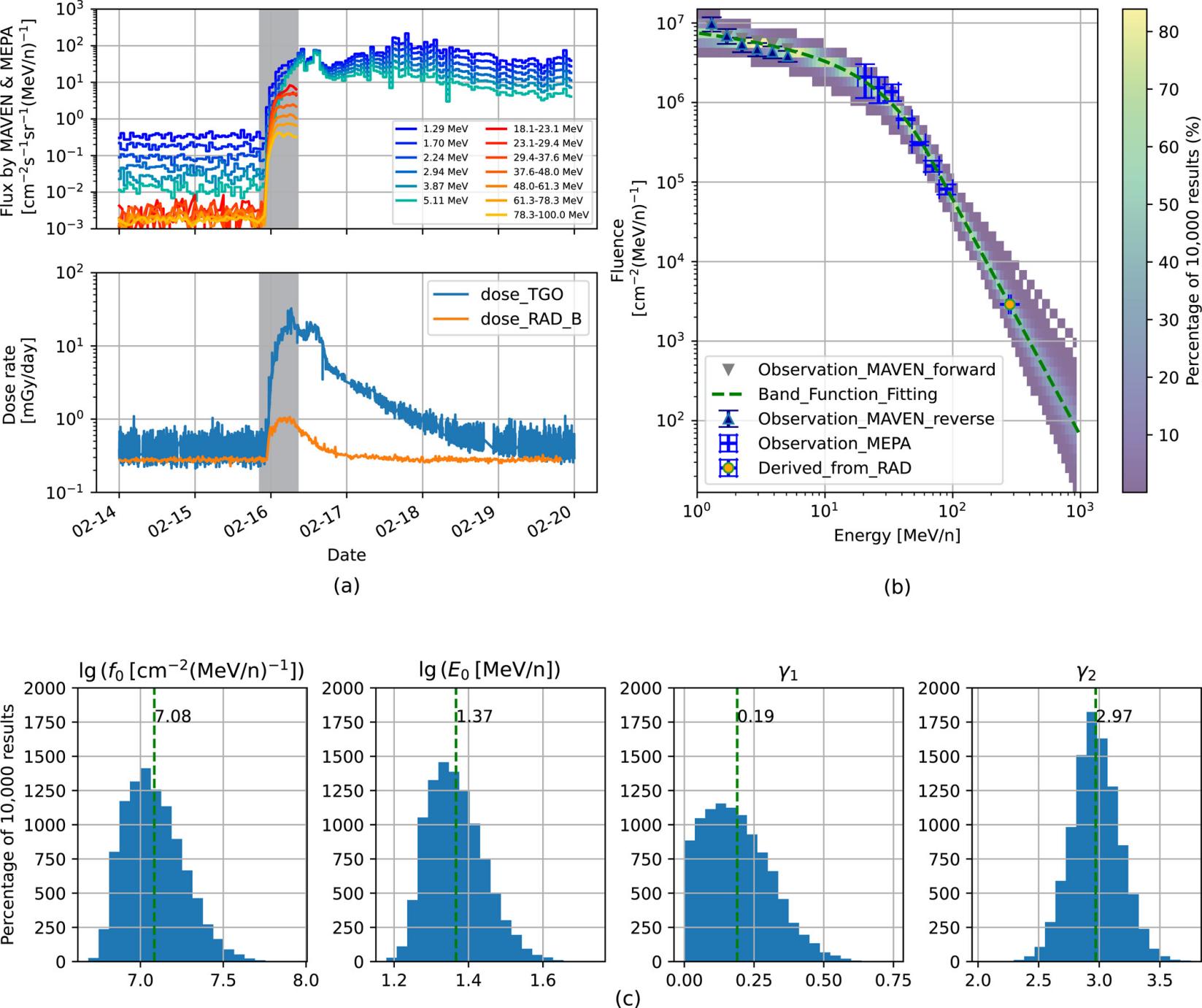 本研究使用了多個探測器數(shù)據(jù)來構建相關質(zhì)子能譜。中低能段的質(zhì)子能譜由能量粒子分析儀和美國高能粒子儀提供。更高能段的質(zhì)子通量是團隊結合火星表面的輻射評估探測器和火星粒子傳輸模型模擬反演得到。研究團隊通過對上述觀測和反演的能譜進行擬合,得到了此次太陽高能粒子事件在火星空間1~1000MeV能量范圍內(nèi)的完整質(zhì)子能譜。