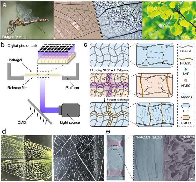 近日,中國(guó)科學(xué)院蘭州化學(xué)物理研究所潤(rùn)滑材料重點(diǎn)實(shí)驗(yàn)室受自然界中廣泛存在的圖案化異質(zhì)結(jié)構(gòu)(如昆蟲(chóng)翅膀和植物葉脈等)啟發(fā),發(fā)展了一種圖案化水凝膠(CSN水凝膠)方案實(shí)現(xiàn)了其多屬性、寬范圍的力學(xué)性能調(diào)控。如圖1所示,研究人員以光固化聚(N-丙烯酰甘氨酰胺)(PNAGA)水凝膠作為軟基質(zhì),通過(guò)先浸泡N-丙烯酰基氨基脲(NASC)前驅(qū)體溶液再以選區(qū)曝光構(gòu)建圖案化硬骨架(PNAGA@PNASC),然后經(jīng)后續(xù)水平衡過(guò)程中的相轉(zhuǎn)化誘導(dǎo)氫鍵重構(gòu)實(shí)現(xiàn)軟基質(zhì)和硬骨架的無(wú)縫互鎖,發(fā)展了具有局部互穿網(wǎng)絡(luò)的圖案化硬骨架強(qiáng)化水凝膠。