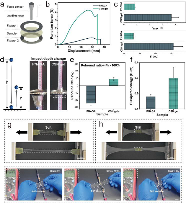 該方法制備的CSN水凝膠能夠在軟基質(zhì)凝膠基礎(chǔ)上,通過(guò)圖案化設(shè)計(jì)(包括圖案形狀、圖案參數(shù)、圖案化比例等)實(shí)現(xiàn)了其機(jī)械性能的增強(qiáng)和調(diào)控。研究人員通過(guò)對(duì)預(yù)制缺陷下的裂紋擴(kuò)展行為實(shí)驗(yàn)、循環(huán)拉伸實(shí)驗(yàn)、穿刺實(shí)驗(yàn)和落球?qū)嶒?yàn)對(duì)所制備的圖案化CSN水凝膠的力學(xué)性能進(jìn)行了系統(tǒng)研究,結(jié)果表明,其韌性可在0.15-18 kJ m-2(120倍)、模量在0.32-5.92 MPa(19倍)內(nèi)進(jìn)行調(diào)控(圖2),并展現(xiàn)出優(yōu)異的預(yù)制缺陷擴(kuò)展和形變不敏感以及抗沖擊等特性(圖3),為適應(yīng)不同應(yīng)用需求及其應(yīng)用過(guò)程中的自適應(yīng)性提供了有效的解決方案。