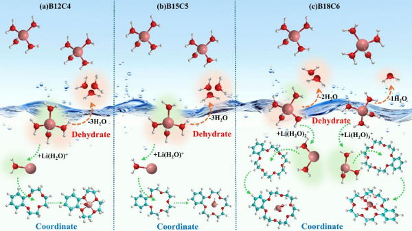 水合鋰離子與苯并-12-冠-4(B12C4)、苯并-15-冠-5(B15C5)和苯并-18-冠-6(B18C6)絡(luò)合機理示意圖
