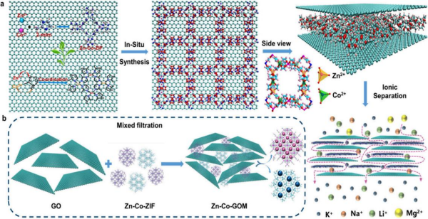 從鹽湖鹵水中獲取鋰資源是最重要的途徑之一。鹵水成分復(fù)雜,Mg2+和Li+水合離子半徑相似,鎂鋰分離難度大。膜分離技術(shù)具有節(jié)能、高效、環(huán)保、操作靈活和成本低等特點(diǎn),可通過精細(xì)調(diào)控膜的孔徑和表面化學(xué)性質(zhì),實(shí)現(xiàn)對(duì)特定離子的選擇性分離。但膜的穩(wěn)定性、耐腐蝕性以及長(zhǎng)期使用后的性能衰退仍然是制約膜分離技術(shù)應(yīng)用的主要問題。針對(duì)上述問題,青海鹽湖所鹽湖有機(jī)質(zhì)與硼鉀分離技術(shù)課題組開發(fā)了一種新型的雙金屬有機(jī)框架(MOF)/氧化石墨烯(GO)復(fù)合膜,以提高鹽湖鋰的提取效率。