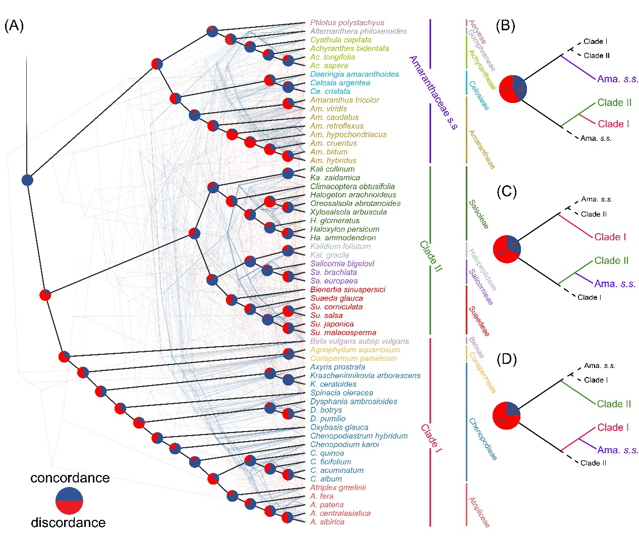 中國科學院西北高原生物研究所青藏高原植物適應(yīng)與進化研究團隊綜合利用質(zhì)體基因組和全長ITS序列,重建了廣義莧科的系統(tǒng)發(fā)育關(guān)系。通過質(zhì)體基因組結(jié)構(gòu)和序列比對分析,發(fā)現(xiàn)濱藜屬(Atriplex)和藜屬(Chenopodium)存在一段長約5200 bp的反向互補區(qū)域。適應(yīng)性進化分析揭示了8個基因受到顯著的正選擇作用,這些基因可能在廣義莧科的進化中起到了驅(qū)動作用。系統(tǒng)發(fā)育結(jié)果表明,傳統(tǒng)藜科為單系類群,建議恢復其至科級分類學水平。對于廣義莧科的科級以下分類群,例如藜屬、鹽生草屬(Halogeton)以及豬毛菜亞族(Subtr. Salsolinae)為并系類群,建議通過建立更多的分類群或?qū)⑥甲澹–henopodieae)和濱藜族(Atripliceae)合并來解決分類問題。核質(zhì)沖突及不完全譜系分選是導致廣義莧科基因樹系統(tǒng)發(fā)育不一致的主要原因。本研究為廣義莧科的系統(tǒng)發(fā)育關(guān)系提供了新的見解,并指出后續(xù)仍需采取多種數(shù)據(jù)集完善廣義莧科的分類修訂。