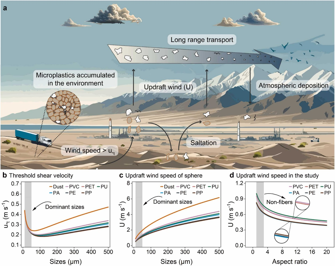 研究團隊通過對祁連山地區(qū)的總懸浮顆粒物進行系統(tǒng)采樣,探究了該地區(qū)的大氣微塑料污染,并使用拉格朗日粒子擴散模型探索了大氣微塑料的潛在源區(qū)。結果顯示,大氣微塑料數(shù)量濃度為4.07±2.37 個 m-3,在春季最高;大氣微塑料質量濃度為0.126±0.152 μg m-3,在冬季最大。微塑料主要聚合物類型為PA、PE、PET、PP、PU和PVC,微塑料數(shù)量集中在小于50微米的尺寸,形狀以碎片為主。局地人類活動對大氣中微塑料濃度的影響有限,潛在源區(qū)的粉塵排放顯著影響大氣微塑料濃度。粉塵和微塑料的相似閾值剪切速度表明它們在潛在源區(qū)的沙塵事件期間共同排放。一旦微塑料被夾帶到氣流中,微塑料懸浮所需較低的上升風速會促進微塑料長距離大氣傳輸。