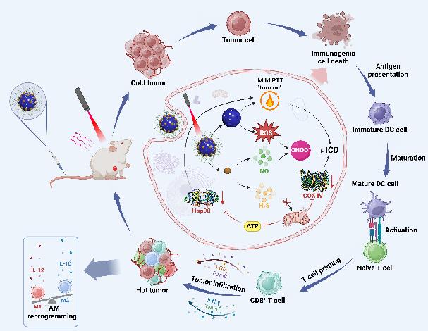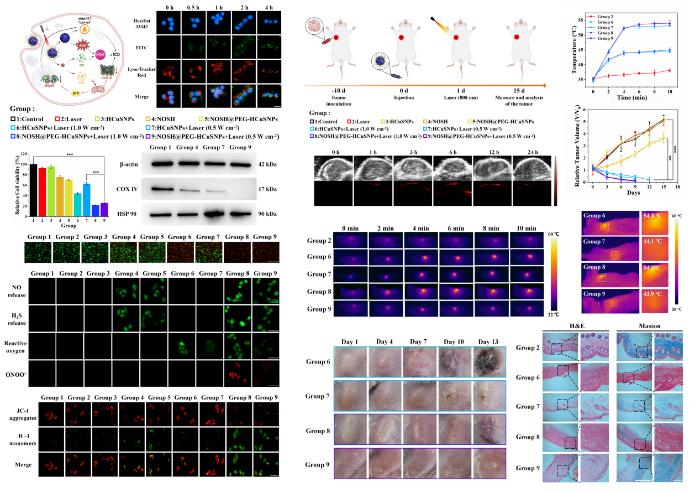 該研究利用雙模態(tài)探針和熒光-質(zhì)譜成像聯(lián)用動(dòng)態(tài)可視化技術(shù),揭示了三重協(xié)同抗腫瘤的作用機(jī)制。結(jié)果表明,利用納米馬達(dá),通過中空硫化銅納米顆粒HCuSNPs負(fù)載氣體信號(hào)分子供體NOSH,在808 nm激光照射下可控釋放H?S/NO,同時(shí)高效轉(zhuǎn)換光能(光熱轉(zhuǎn)化效率達(dá)27.8%),確保局部溫度維持在45℃以下,既能殺傷腫瘤細(xì)胞,又避免正常組織損傷。此外,該納米馬達(dá)不僅通過H?S阻斷線粒體能量代謝、NO-ROS反應(yīng)生成ONOO?雙路徑誘導(dǎo)腫瘤凋亡,還可顯著重塑腫瘤免疫微環(huán)境,促進(jìn)M1型巨噬細(xì)胞極化(比例提升3倍)、CTLs浸潤(增加5倍),全面提升免疫抗癌能力。