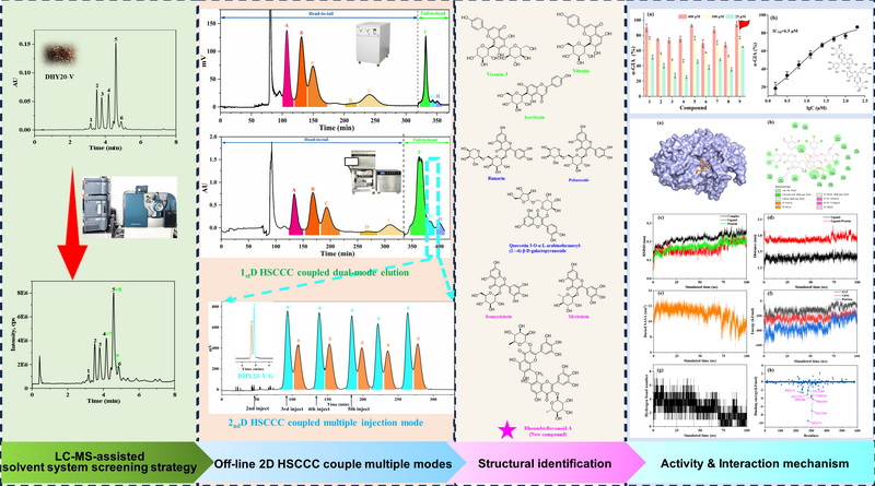 中國科學(xué)院西北高原生物研究所高原藏藥資源質(zhì)控與藥理毒理評價研究團(tuán)隊(duì)通過建立離線二維高速逆流色譜結(jié)合雙模式洗脫與重復(fù)進(jìn)樣連續(xù)洗脫的分離技術(shù),成功從唐古特大黃葉中分離得到1個亞甲基橋接的黃酮苷新型二聚體(Rheumbisflavonoid A)、3個黃酮碳苷和5個黃酮氧苷。Rheumbisflavonoid A的α-葡萄糖苷酶抑制活性顯著高于其余8個化合物。通過多維度的分子相互作用研究發(fā)現(xiàn),該化合物與α-葡萄糖苷酶具有高的結(jié)合常數(shù),通過范德華力和氫鍵作用占據(jù)α-葡萄糖苷酶的活性位點(diǎn)并形成穩(wěn)定的復(fù)合物,改變關(guān)鍵氨基酸殘基和多肽骨架的微環(huán)境,使埋藏的疏水環(huán)境暴露。此外,該化合物與α-葡萄糖苷酶結(jié)合后顯著降低其α-螺旋含量,從而使酶失去催化活性。該研究為復(fù)雜天然產(chǎn)物的分離純化及其與α-葡萄糖苷酶的相互作用機(jī)制提供了新的思路。