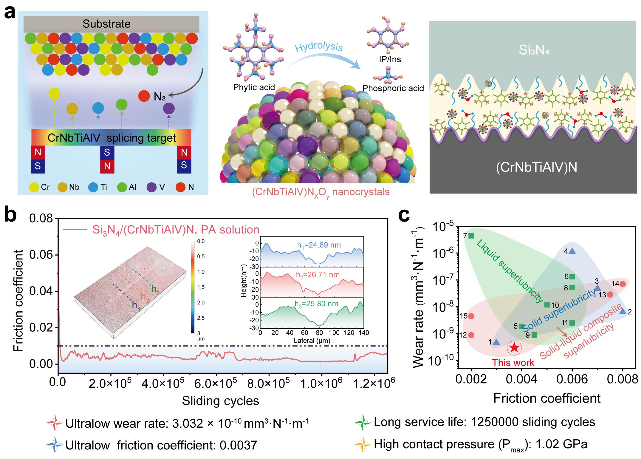 雖然水基超潤滑材料具有諸多優(yōu)勢,但其對金屬摩擦副的腐蝕問題會影響超潤滑狀態(tài)的長期穩(wěn)定性。為此,中國科學院蘭州化學物理研究所潤滑材料全國實驗室研究團隊近期提出了一種基于摩擦催化效應(yīng)的“固-液復(fù)合超潤滑”策略,基于天然有機酸植酸和高熵陶瓷涂層的協(xié)同作用實現(xiàn)了優(yōu)異的減摩抗磨性能,有效地避免了水基潤滑劑的腐蝕問題。通過磁控濺射技術(shù)在軸承鋼表面沉積了(CrNbTiAlV)N高熵陶瓷薄膜(圖1),表現(xiàn)出優(yōu)異的力學性能并提供了豐富的反應(yīng)位點。此外,在摩擦過程中高熵陶瓷表面還形成了一層鈍化層,可有效防止水基潤滑劑對鋼基體的腐蝕。