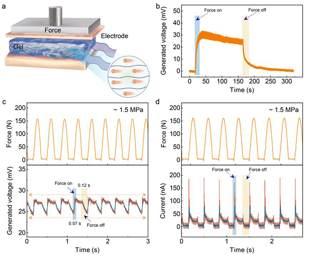 界面之間的運(yùn)動(dòng)、行為會(huì)耗散大量的機(jī)械能,比如界面摩擦,潤滑是減小能源消耗的有效途徑。然而,對(duì)于一些極端工況,界面的機(jī)械耗散是不可避免的,為此,針對(duì)極端環(huán)境下的高承載或高抗沖擊工程軟材料需求,超滯后介導(dǎo)的機(jī)械訓(xùn)練構(gòu)建的超強(qiáng)共晶凝膠可通過力電轉(zhuǎn)導(dǎo)的方式收集機(jī)械能,并將轉(zhuǎn)化的電能作為傳感信號(hào)反映壓力應(yīng)變(圖3),該研究展示了共晶凝膠在高溫環(huán)境中的力學(xué)穩(wěn)定性及作為離子壓電機(jī)械感受器在壓力驅(qū)動(dòng)力電轉(zhuǎn)導(dǎo)的響應(yīng)性能,實(shí)現(xiàn)了強(qiáng)韌力學(xué)與電學(xué)性能之間的力?電耦合的協(xié)同設(shè)計(jì),為性能和功能的適配耦合提供了全新的設(shè)計(jì)范式和構(gòu)建策略。