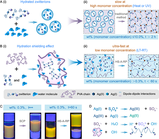 近日,中國(guó)科學(xué)院蘭州化學(xué)物理研究所潤(rùn)滑材料全國(guó)重點(diǎn)實(shí)驗(yàn)室材料表面與界面研究組周峰研究員團(tuán)隊(duì)提出了基于一種基于“水合屏蔽”效應(yīng)的聚兩性離子水凝膠制備新方法——HS-A-RP,創(chuàng)新地將PVA作為水合屏蔽劑引入Ag+-S2O82-氧化還原催化體系中,實(shí)現(xiàn)了通用性兩性離子單體在寬單體濃度范圍(質(zhì)量分?jǐn)?shù):0.3-50 wt%)、寬溫域(-5℃-37℃)內(nèi)的超快速聚合(t<60 秒),且反應(yīng)而無需外部能量(紫外光/熱)的輸入。
