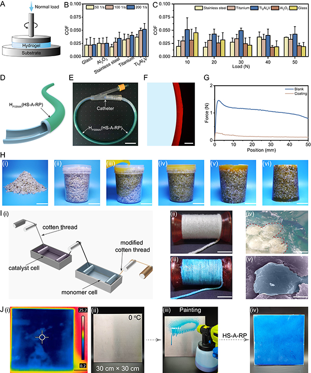與傳統(tǒng)光/熱引發(fā)體系相比,HS-A-RP 制備的聚兩性離子水凝膠不僅具有更致密的網(wǎng)絡(luò)結(jié)構(gòu)和更好的機(jī)械性能,還展現(xiàn)出了優(yōu)異的抗溶脹、潤(rùn)滑、抗菌和防污性能。通過HS-A-RP方法制備的聚兩性離子水凝膠既能夠作為功能涂層有效改善生物醫(yī)用器械的表面潤(rùn)滑性,又能實(shí)現(xiàn)對(duì)熱敏材料和砂礫的原位封裝。此外,快速凝膠化和寬溫域內(nèi)可反應(yīng)的特性使HS-A-RP能夠在不同基底表面和極端穩(wěn)定環(huán)境條件下規(guī)?;苽渚蹆尚噪x子水凝膠涂層。該方法不僅為聚兩性離子水凝膠的化學(xué)合成提供了新途徑,還極大地拓展了其在生物醫(yī)療、工程裝備等領(lǐng)域應(yīng)用領(lǐng)域。