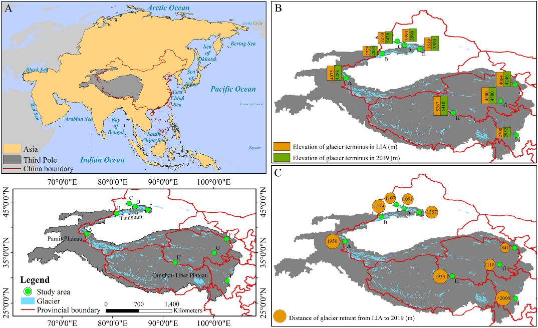 (A)研究區(qū)地理區(qū)位圖,(B)被研究冰川在小冰期和2019年的冰川末端海拔,(C)被研究冰川在小冰期至2019年間的冰川退縮距離