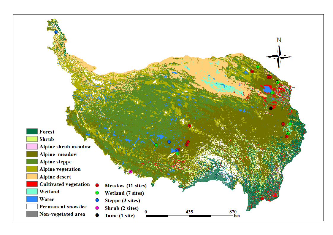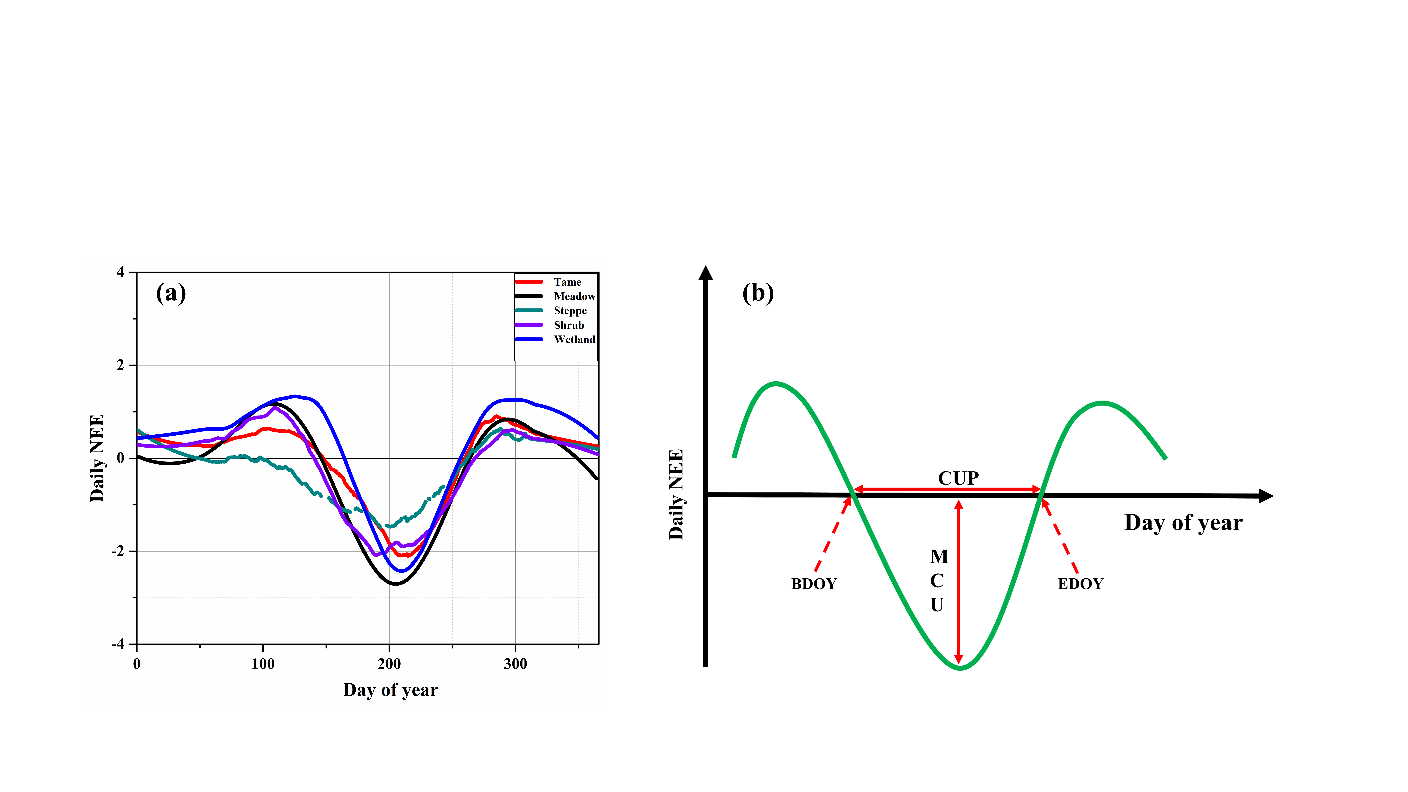 青藏高原因獨(dú)特地形被譽(yù)為地球"第三極",其 146 萬km2的高寒草地生態(tài)系統(tǒng)是重要碳匯,碳同化能力的季節(jié)及年際變化受氣候因子調(diào)控。該區(qū)域草地碳固存過程分為碳吸收期與碳排放期,但兩個時期對凈生態(tài)系統(tǒng)碳交換(NEE)年際變異的相對貢獻(xiàn)一直未明確。加之青藏高原偏遠(yuǎn)地區(qū)碳通量觀測數(shù)據(jù)匱乏且存在共享限制,不同類型高寒草地碳吸收周期時長、碳吸收速率及其控制因素尚不明晰,制約了對高原碳循環(huán)機(jī)制的認(rèn)知。