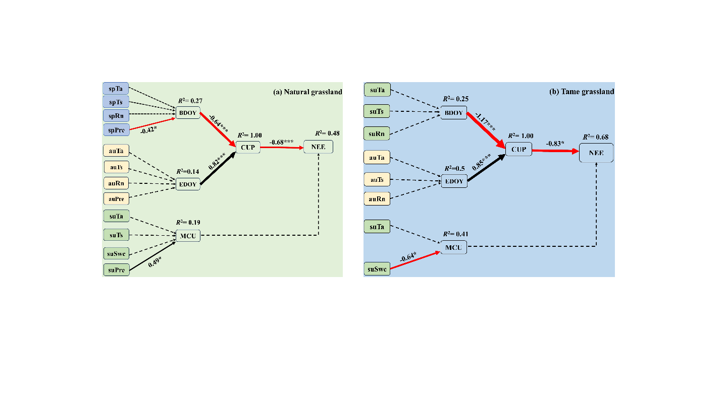通過研究發(fā)現(xiàn),NEE 年際變異中 38% 的貢獻(xiàn)來自 CUP, MCU貢獻(xiàn) 18%,證實(shí)延長碳吸收周期對增強(qiáng)碳匯的效應(yīng)優(yōu)于提升最大碳吸收速率。同時,天然草地CUP起始日期受春季降水顯著驅(qū)動,春季降水成為啟動碳吸收周期的關(guān)鍵"扳機(jī)";夏季水分可利用性對天然草地 MCU 呈負(fù)向調(diào)節(jié),卻能促進(jìn)人工草地 MCU 提升。人類管理措施(如播種、收割)主導(dǎo)人工草地 CUP 動態(tài),其碳吸收周期(106 天)較天然草地縮短約 30 天,直接影響 NEE 年際波動。生態(tài)系統(tǒng)對比顯示,高寒草原雖擁有最長 CUP(147 天),但碳吸收強(qiáng)度最低;高寒濕地以最高 MCU(-5.02 g C m?2 d?1)成為高原最強(qiáng)"碳匯熱點(diǎn)"。此外,冬季生態(tài)系統(tǒng)呼吸占全年總量 15%,主要受降雪量和凈輻射調(diào)控;CUP 持續(xù)時間由早期降水和草地類型共同決定,是導(dǎo)致 NEE 年際變異及生態(tài)系統(tǒng)差異的核心因素。未來將聚焦氣候異常對 CUP 和 MCU 的影響機(jī)制,進(jìn)一步完善高原碳匯動態(tài)預(yù)測模型,為全球變化背景下的生態(tài)安全保障提供科技支撐。
