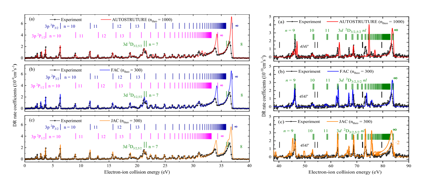 基于蘭州重離子加速器冷卻儲(chǔ)存環(huán)開展的高電荷態(tài)離子的雙電子復(fù)合精密譜學(xué)實(shí)驗(yàn)具有較高的能量分辨,且其電子-離子相對(duì)能量可大范圍精密調(diào)制,是目前唯一能夠精確測(cè)量低能碰撞復(fù)合截面關(guān)鍵數(shù)據(jù)的實(shí)驗(yàn)方法。科研團(tuán)隊(duì)在對(duì)M殼層類鈉鐵離子 Fe15+的實(shí)驗(yàn)中,成功測(cè)量了 0-90 eV 能量范圍內(nèi)的復(fù)合速率系數(shù)。他們將實(shí)驗(yàn)結(jié)果與最新的理論Flexible Atomic Code (FAC) 、AUTOSTRUCTURE、Jena Atomic Calculator (JAC)計(jì)算的結(jié)果仔細(xì)對(duì)比,解析出每個(gè)共振結(jié)構(gòu)的來(lái)源。同時(shí),科研人員從雙電子復(fù)合速率系數(shù)得到了可用于等離子體建模的等離子體速率系數(shù),并與此前的理論數(shù)據(jù)作了對(duì)比研究。