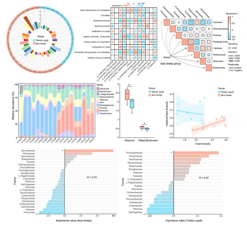 中國(guó)科學(xué)院西北高原生物研究所動(dòng)物生態(tài)與資源保護(hù)研究團(tuán)隊(duì)在青海省昆侖山地區(qū)采集了西藏盤羊與巖羊的新鮮糞便樣本,結(jié)合宏基因組測(cè)序與植物 trnL片段的高通量測(cè)序技術(shù),深入分析了兩者腸道菌群組成、功能特征及食性結(jié)構(gòu)與腸道菌群在生態(tài)適應(yīng)與營(yíng)養(yǎng)生態(tài)位分化中的潛在作用。研究發(fā)現(xiàn),西藏盤羊與巖羊共棲于高寒生態(tài)環(huán)境中,但其腸道菌群在組成結(jié)構(gòu)與功能特征方面表現(xiàn)出了顯著差異。食性多樣性的高低并不必然反映腸道菌群多樣性的水平,其中西藏盤羊雖食性相對(duì)單一,但其腸道菌群多樣性更高,具有更強(qiáng)的代謝適應(yīng)性與纖維降解能力;而巖羊擁有更廣泛的植物攝食譜,卻表現(xiàn)出在糖類代謝相關(guān)功能上更強(qiáng)的腸道菌群代謝適應(yīng)能力。綜合來看,腸道菌群與食性之間的協(xié)同作用可能在推動(dòng)兩物種營(yíng)養(yǎng)生態(tài)位分化中發(fā)揮重要作用。此外,兩種動(dòng)物在抗生素耐藥基因組成上也存在差異,提示該類指標(biāo)在未來野生動(dòng)物健康評(píng)估中具有潛在應(yīng)用價(jià)值。本研究揭示了腸道菌群作為宿主環(huán)境適應(yīng)和生態(tài)位分化的重要調(diào)控因子,其與食性協(xié)同作用推動(dòng)了高原野生動(dòng)物的生態(tài)位分化。研究成果為理解大型食草動(dòng)物腸道菌群與環(huán)境適應(yīng)及生態(tài)位分化提供了全新視角,也為瀕危物種保護(hù)和高原生態(tài)系統(tǒng)可持續(xù)發(fā)展提供了重要參考。