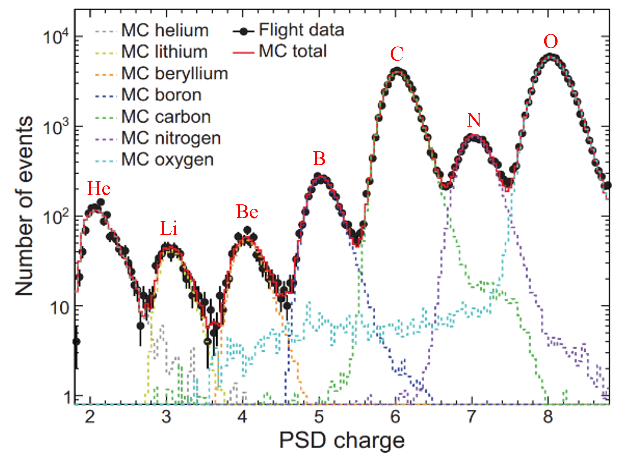 圖1:“悟空”號(hào)用來(lái)鑒別宇宙射線(xiàn)核素的PSD電荷譜