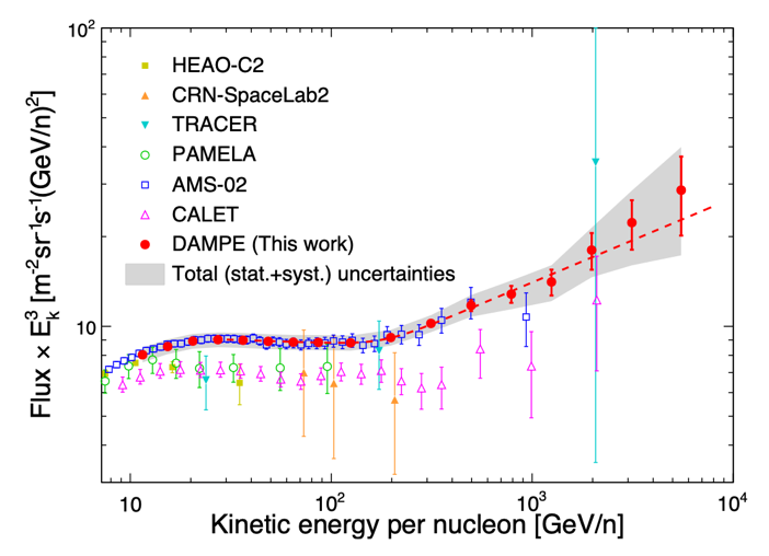 近期,暗物質(zhì)粒子探測(cè)衛(wèi)星(DAMPE)“悟空”號(hào)國(guó)際合作組在高能宇宙線(xiàn)能譜測(cè)量方面取得重要進(jìn)展,獲得了宇宙射線(xiàn)硼元素在10 GeV/n–8 TeV/n的微分通量譜,首次發(fā)現(xiàn)了182 GeV/n附近能譜“硬化”的現(xiàn)象。研究成果發(fā)表于《物理評(píng)論快報(bào)》(Physical Review Letters)。