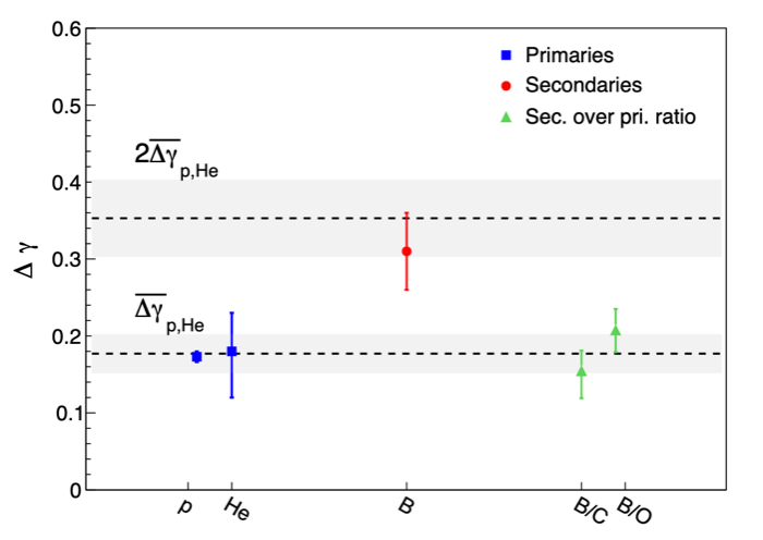 圖3:“悟空”號(hào)觀測(cè)到的硼元素譜指數(shù)變硬程度(?γ)約為初級(jí)宇宙線(xiàn)質(zhì)子和氦核的兩倍