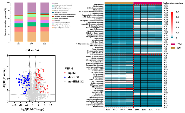 非靶向代謝組學分析共鑒定出1242種代謝物。在扁蓿豆植株甲醇提取物中,短鏈有機酸及其衍生物的相對豐度較高;根際土壤水提物中富含生物堿和黃酮類化合物;而根際土壤甲醇提取物則以長鏈有機酸及其衍生物為主。進一步發(fā)現(xiàn),短鏈有機酸、其衍生物以及黃酮類化合物可能為與扁蓿豆化感作用相關(guān)的關(guān)鍵候選化感物質(zhì)。